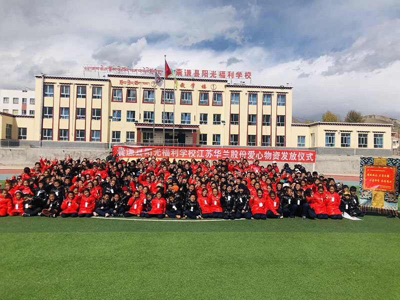 在青海玉樹囊謙縣,有一所陽光福利學校。這個學校的學生大多是當地的孤兒、單親家庭和特困生。公司華一敏總經理在去年十月份一次偶然的機會中得知學校的學生因買不起冬裝在為即將來臨的寒冬發愁,他第一時間就以華蘭股份公司名義訂制了290件羽絨服及290雙保暖鞋給孩子們送去,同時也號召公司所有員工義捐,向孩子們獻出一份愛心。