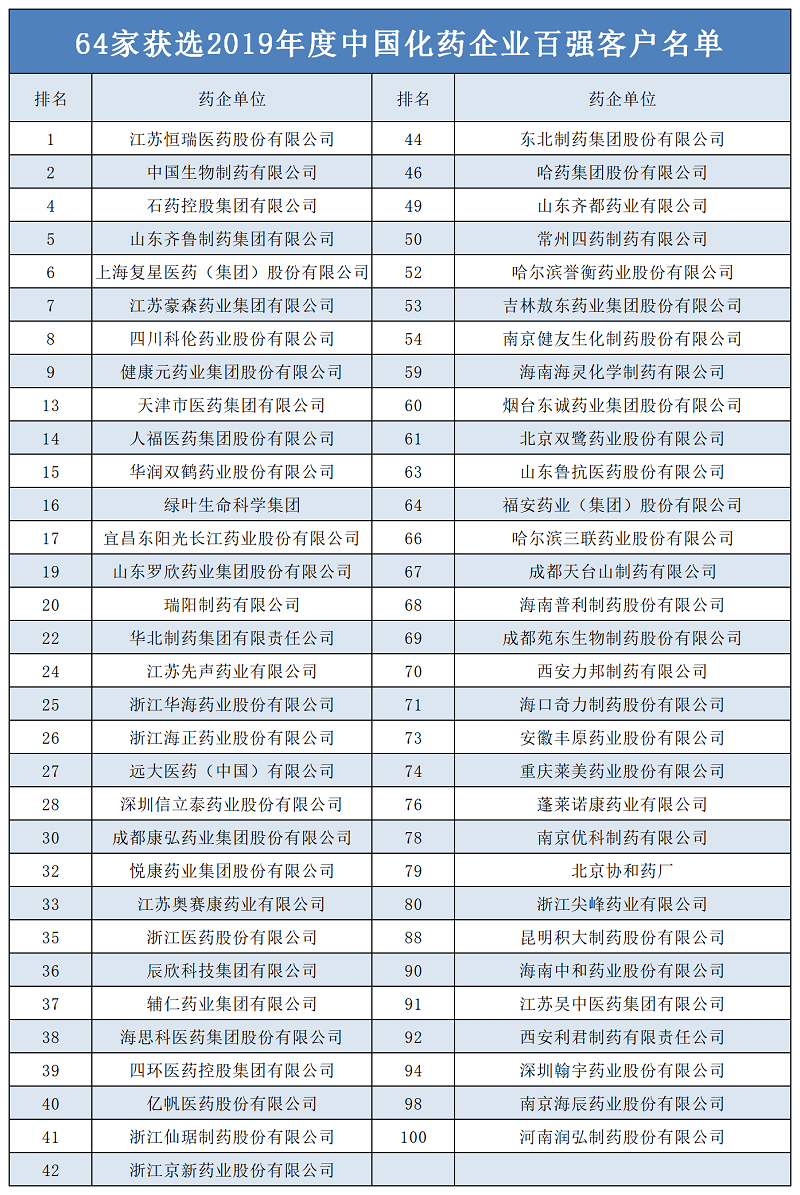 “中國化藥企業(yè)TOP100排行榜”